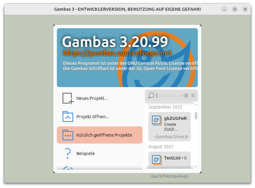 Am Dienstag, dem 07.10.2025 um 00:06 +0000 schrieb Benoît Minisini (@bminisini): > > Benoît Minisini pushed to branch master at Gambas / gambas [2] > Commits: * > 5a345ac2 [1] > > by Benoît Minisini at 2025-10-07T02:05:34+02:00 > Form editor: Display the controls of the libraries used by the > project in the toolbox. > > [DEVELOPMENT ENVIRONMENT] > * BUG: Form editor: Display the controls of the libraries used by > the project in the toolbox. Salut Benoît, perhaps something went wrong. No more File ? in IDE And I can't see the libraries added at Project/properties/Libreries in the Toolbox -- Amicalement Charlie [System] Gambas=3.20.99 5a345ac28 (master) OperatingSystem=Linux Distribution=Ubuntu 24.04.3 LTS (Noble Numbat) Kernel=6.8.0-85-generic Architecture=x86_64 Cores=4 Memory=5878M Language=de_DE.UTF-8 Platform=x11 Desktop=GNOME DesktopResolution=96 DesktopScale=8 WidgetTheme=yaru Font=Ubuntu,11 DarkTheme=False [Programs] dpkg=Debian »dpkg« Paketmanagement-Programm Version 1.22.6 (amd64). gcc=gcc (Ubuntu 13.3.0-6ubuntu2~24.04) 13.3.0 git=git version 2.43.0 msgmerge=msgmerge (GNU gettext-tools) 0.21 [Libraries] Cairo=libcairo.so.2.11800.0 Curl=libcurl.so.4.8.0 DBus=libdbus-1.so.3.32.4 GDK2=libgdk-x11-2.0.so.0.2400.33 GDK3=libgdk-3.so.0.2409.32 GStreamer=libgstreamer-1.0.so.0.2402.0 GTK+2=libgtk-x11-2.0.so.0.2400.33 GTK+3=libgtk-3.so.0.2409.32 OpenGL=libGL.so.1.7.0 Poppler=libpoppler.so.134.0.0 QT5=libQt5Core.so.5.15.13 QT6=libQt6Core.so.6.4.2 RSvg=librsvg-2.so.2.50.0 SDL=libSDL2-2.0.so.0.3000.0 SQLite3=libsqlite3.so.0.8.6 [Environment] CLUTTER_DISABLE_MIPMAPPED_TEXT=1 DBUS_SESSION_BUS_ADDRESS=unix:path=/run/user/1000/bus DEBUGINFOD_URLS=https://debuginfod.ubuntu.com DESKTOP_SESSION=gnome-xorg DISPLAY=:0 GB_GUI=gb.gtk3 GDMSESSION=gnome-xorg GIO_LAUNCHED_DESKTOP_FILE=<home>/Schreibtisch/gambas3.desktop GIO_LAUNCHED_DESKTOP_FILE_PID=177812 GJS_DEBUG_OUTPUT=stderr GJS_DEBUG_TOPICS=JS ERROR;JS LOG GNOME_DESKTOP_SESSION_ID=this-is-deprecated GPG_AGENT_INFO=/run/user/1000/gnupg/S.gpg-agent:0:1 GSM_SKIP_SSH_AGENT_WORKAROUND=true GTK_MODULES=gail:atk-bridge HOME=<home> INVOCATION_ID=ced68c92b0304b26986305020ed4f1af JOURNAL_STREAM=8:35925 LANG=de_DE.UTF-8 LANGUAGE=de_DE.UTF-8 LIBVIRT_DEFAULT_URI=qemu:///system LOGNAME=<user> MANAGERPID=2472 MEMORY_PRESSURE_WATCH=/sys/fs/cgroup/user.slice/user-1000.slice/user@1000.service /session.slice/org.gnome.Shell@x11.service/memory.pressure MEMORY_PRESSURE_WRITE=c29tZSAyMDAwMDAgMjAwMDAwMAA= PATH=/usr/local/sbin:/usr/local/bin:/usr/sbin:/usr/bin:/sbin:/bin:/usr/ games:/usr/local/games:/snap/bin:/snap/bin PWD=<home> QTWEBENGINE_DICTIONARIES_PATH=/usr/share/hunspell-bdic/ QT_ACCESSIBILITY=1 QT_IM_MODULE=ibus QT_LOGGING_RULES=*.debug=false SESSION_MANAGER=local/<hostname>:@/tmp/.ICE- unix/2783,unix/<hostname>:/tmp/.ICE-unix/2783 SHELL=/bin/bash SHLVL=0 SSH_AUTH_SOCK=/run/user/1000/keyring/ssh SYSTEMD_EXEC_PID=2816 TZ=:/etc/localtime USER=<user> USERNAME=<user> WINDOWPATH=2 XAUTHORITY=/run/user/1000/gdm/Xauthority XDG_CONFIG_DIRS=/etc/xdg/xdg-gnome-xorg:/etc/xdg XDG_CURRENT_DESKTOP=GNOME XDG_DATA_DIRS=/usr/share/gnome- xorg:/usr/share/gnome:<home>/.local/share/flatpak/exports/share:/var/li b/flatpak/exports/share:/usr/local/share/:/usr/share/:/var/lib/snapd/de sktop XDG_MENU_PREFIX=gnome- XDG_RUNTIME_DIR=/run/user/1000 XDG_SESSION_CLASS=user XDG_SESSION_DESKTOP=gnome-xorg XDG_SESSION_TYPE=x11 XMODIFIERS=@im=ibus [1] 5a345ac2 https://gitlab.com/gambas/gambas/-/commit/5a345ac28b023d01ec26d8303169a46c6c7ecb62 [2] Gambas / gambas https://gitlab.com/gambas/gambas