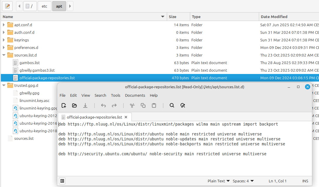 On Tuesday, November 25th, 2025 at 16:53, Gianluigi <gradobag@xxxxxxxxxxx> wrote: > Il 25/11/25 16:21, gbWilly ha scritto: > > > I am not confused just pointing out the reality > > THIS -> libmysqlclient-dev : Depends: libmysqlclient21 (=8.0.44-0ubuntu0.24.04.1) but 8.0.44-1ubuntu22.04 is to be installed > > MEANS -> ubuntu22.04 repo is being used to pull in dependencies, hence jammy (not noble). You are NOT pulling Ubuntu packages from noble repo, but from jammy repo!! > > What did you do, update from jammy to noble, as it seems you got all your repo sources mixed up? > > > > What I read is: > > -> Gambas repo is set to use noble > > -> Ubuntu repo is set to use jammy > > > > Check it.. > > Correct it... > > And try again > > > Dear Willy, > > It's impossible for me to think you're confused; if anything, it's just > the opposite. > If I said this, it's due to my poor command of the English language, and > I apologize. > > Ian installed the Mint 22.2 (zara) Cinnamon distribution. > I suggested this: > Delete all the old Gambas3-related files: first, he must check that > everything is clean of Gambas in the Update Manager: Edit menu > > > Software Sources in the PPA, Additional Repositories, and Authentication > Keys tabs. > Then follow gbWilly instructions to delete Gambas3. > > So if Ian wants to have a working Gambas3, copy the commands from this > page, knowing that Mint 22 depends on Ubuntu 24.04: > https://gambaswiki.org/wiki/doc/packages#t9 > > Do you think this is the correct procedure, or should it be done > differently? > If it is done differently, can you kindly explain how? > There is nothing wrong with the instructions, they are correct. And this part: "libmysqlclient-dev : Depends: libmysqlclient21 (=8.0.44-0ubuntu0.24.04.1)" indicates that either gambas or Ubuntu repository is the wrong version. This part: "but 8.0.44-1ubuntu22.04 is to be installed" indicates the ubuntu 22.04 version is available from Ubuntu repo, so the jammy repo This would mean that: Ian used the proper instructions and if he is running Mint 22, somehow his Ubuntu sources seem to point to jammy instead of noble. Check the file /etc/apt/sources.list.d/official-package-repositories.list if the links pointing to ubuntu point to noble, those of mint should point to wilma (see screenshot attached) In that same folder you sould find the .list file pointing to osb repository that should contain "xUbuntu_24.04" in it's line (the OpenSuse implementation of a Debian list file is weird but working). Hope that clarifies the situation. But there is a conflict in the repo sources causing trouble. Was this a fresh install or an upgrade from jammy/mint 21? gbWilly GambOS Gambas3 for Debian/Ubuntu ...there is always a Catch if things go wrong! Sent with Proton Mail secure email.