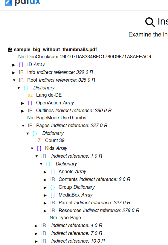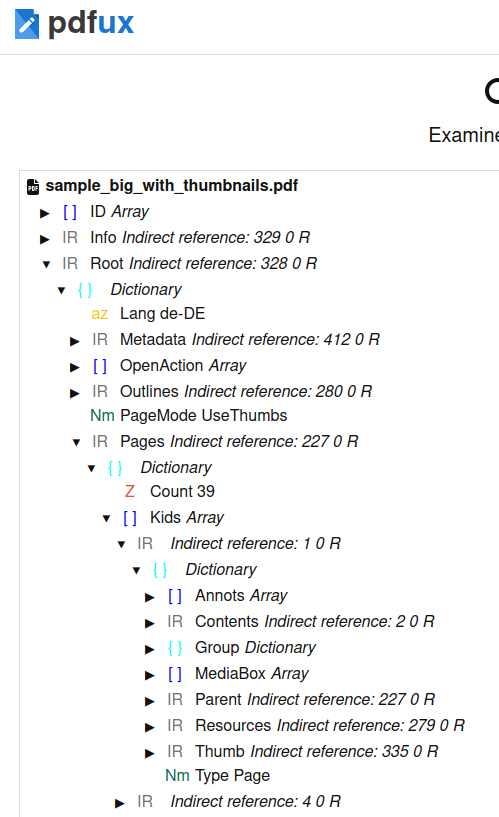 If you wish, you can upload "F16866_TUF_GAMING_B460-PLUS_UM_V2_WEB.pdf" to that site. It presents the information in a tree view. Just drill down until you get into the "Kids" Array (be aware that this file has a nested "Kids" array that you'll also need to expand). I did this, and this particular PDF has no "Thumb" references.