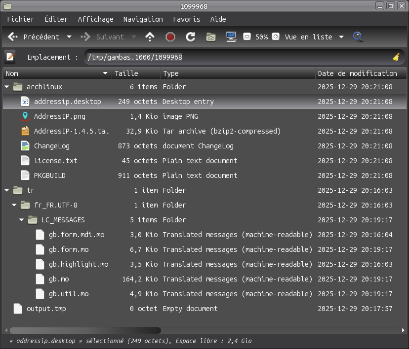 Le lundi 29 décembre 2025 à 17:51 +0100, Benoît Minisini a écrit : > Le 29/12/2025 à 17:21, CD a écrit : > > Good evening, > > > > I tried to create packages for Arch Linux of an application ! > > Here is the message I receive: > > > > --------------------------------- > > > > Sauvegarde du fichier CHANGELOG. > > > > ============================================================================ > > == > > > > CRÉATION DU PAQUET POUR ARCHLINUX. > > > > > > Fabrication du répertoire de construction. > > cd '/tmp/gambas.1000/337171/archlinux' > > makepkg -m -g >> PKGBUILD > > ==> ERROR: An unknown error has occurred. Exiting... > > User defined signal 1 > > > > La construction des paquets a échoué. > > Package.MakeArchPackage.2516: 'makepkg' a échoué. > > > > ---------------------------------------------------------------------------- > > ------------- > > > > I carefully reread:https://gambaswiki.org/wiki/howto/packageyourapp?l=fr ; > > <https://gambaswiki.org/wiki/howto/packageyourapp?l=fr> > > > > What to do??? > > Good question. It works on my Manjaro system, so it must be a problem on > Ubuntu. But which one? > > Note that the "==> ERROR: An unknown error has occurred. Exiting... User > defined signal" message is printed by 'makepkg', not by the IDE. > Hello, I've looked into the problem a bit more. Here's an image showing the contents of the temporary directory. here is the content of: /tmp/gambas.1000/1099968/archlinux/PKGBUILD # generated by the gambas3 ide # Maintainer: Claude DESSERÉ <dessere.claude@xxxxxx> pkgname=addressip _realname=IPAddress pkgdesc='Monitoring IP Address' pkgver=1.4.5 pkgrel=1 arch=('any') url='http://www.endoftheinternet.com/' changelog=ChangeLog license=('custom:General Public License') depends=('gambas3-gb-image>=3.21' 'gambas3-gb-image<=3.99.0' 'gambas3-gb- qt5>=3.21' 'gambas3-gb-qt5<=3.99.0' 'gambas3-gb-form>=3.21' 'gambas3-gb- form<=3.99.0' 'gambas3-gb-dbus>=3.21' 'gambas3-gb-dbus<=3.99.0' 'gambas3-gb- desktop>=3.21' 'gambas3-gb-desktop<=3.99.0' 'gambas3-gb-settings>=3.21' 'gambas3-gb-settings<=3.99.0' 'gambas3-gb-net>=3.21' 'gambas3-gb-net<=3.99.0' 'gambas3-gb-net-curl>=3.21' 'gambas3-gb-net-curl<=3.99.0' 'gambas3-gb-qt5- webview>=3.21' 'gambas3-gb-qt5-webview<=3.99.0') makedepend=('gambas3-devel') source=(${_realname}-$pkgver.tar.bz2 license.txt\ 'addressip.desktop' 'AddressIP.png') See my previous email "makepkg" for more information. Does this information give you any clues? Is makepkg version 6.0.2-6ubuntu2 the latest version for Ubuntu? Do other Ubuntu 24.04.3 LTS users have the same problem, or are they experiencing the same issue with Linux Mint or other distributions? Thank you very much for your answers. Regards