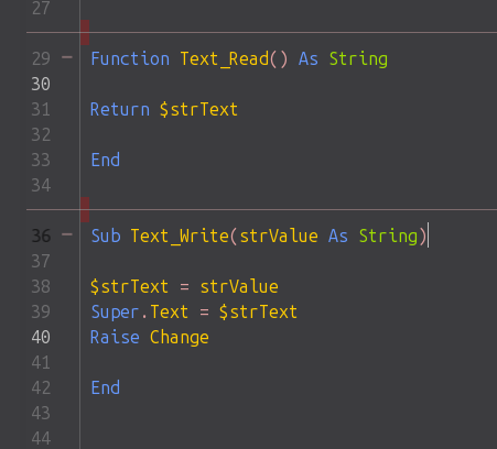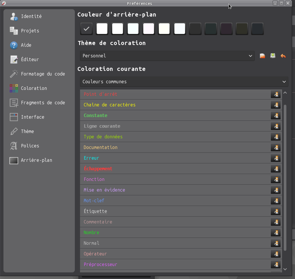 Le samedi 07 février 2026 à 23:30 +0100, Benoît Minisini a écrit : > Le 07/02/2026 à 19:47, CD a écrit : > > Hello, > > > > Since updating to Gambas=3.21.3 9c8e9a3 (master), > > the selection (of a word, a line, or the entire page using Ctrl+A) > > in the IDE's code window is transparent. > > Only the line numbers change color. > > I've looked in the Tools/Preferences menu without success. > > I checked the exported and re-imported theme file; there is indeed a > > selection setting, > > but changing its value doesn't affect the code window. > > What do I need to do to see the selection? > > > > P.S.: In Find/Replace, the searched word is correctly selected!Regards > > > > Please show a screenshot of what you are talking about. > Thank you for your reply. Here are three screenshots: 1) The code "Sub Text_Write(strValue As String)" is selected. 2) PreferencesColor 3) PreferencesBackground: Clicking on any background has no effect. I have copied the contents of the exported theme file below. Regards [Gambas Highlighting Theme 1.0] Normal="#C0C0C0" Keyword="#6699FF" Datatype="#9FDF00" Function="#E06FE0" Operator="#DF9F9F" Symbol="#FFCC00" Number="#1FDF1F" String="#FFFF00" Comment="#AB8A8A" Documentation="#FFD480" Preprocessor="#DF5FFF" Breakpoint="#C00000" Current="#606060,Bold" Highlight="#CF9FFF" Error="#00FFFF" Escape="#EF3F3F,Bold,Dotted" Label="#E0E0E0,Dotted" Constant="#5FBF5F,Bold" Added="#004000,Bold" Removed="#800000,Strikeout" Class="#FF5F00" Id="#FFBF1F" Element="#FF3F3F" Property="#EF1F1F" Pseudo="#00E0E0" Rule="#FF3FFF" Important="#FF00FF" File="#1F1F1F" Header="#FFD480" Position="#003F3F" Markup="#00C0C0" Attribute="#FF2A2A" Value="#DFBF00" Entity="#FF6100" WebMarkup="#FF00FF" WebComment="#FFD480" WebArgument="#FF00FF" Color1="#3F9FFF" Color2="#00A000" Color3="#FF5F5F" Color4="#9C54F0" Color5="#C0A300" Color6="#7373B4" Color7="#FFA95F" Color8="#FF5FFF" Shebang="#DF5FFF" Expansion="#9FDF00" Command="#E06FE0" AtRule="#DF5FFF" PseudoClass="#FFFF00" PseudoElement="#FFFF00" Color="#FFFF00" Tag="#5FBF5F,Bold" TagAttribute="#6699FF" Column1="#3F9FFF" Column2="#00A000" Column3="#FF5F5F" Column4="#9C54F0" Column5="#C0A300" Column6="#7373B4" Column7="#FFA95F" Column8="#FF5FFF" Prolog="#DF5FFF" CData="#5FBF5F,Bold" Diff="#E06FE0" Index="#6699FF" Doctype="#DF5FFF" Slot="#DF5FFF" RegExp="#9FDF00" Commit="#FFFF00" Author="#E06FE0" Date="#DF5FFF" Merge="#1FDF1F" Limit="#6699FF" RemovedCommit="#9FDF00" AddedCommit="#E06FE0" Selection="#BFBFBF" CurrentLine="#DBDBDB" Alternate="#606060"